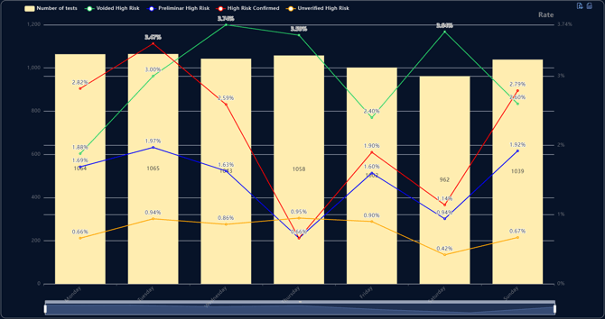 Il report Tasso HR-Conf vs Conteggio Test per Giorno della Settimana mette in relazione il numero di test eseguiti ogni giorno con la percentuale di casi ad alto rischio confermati. Questo aiuta a identificare se alcuni giorni mostrano una maggiore incidenza di rischi.