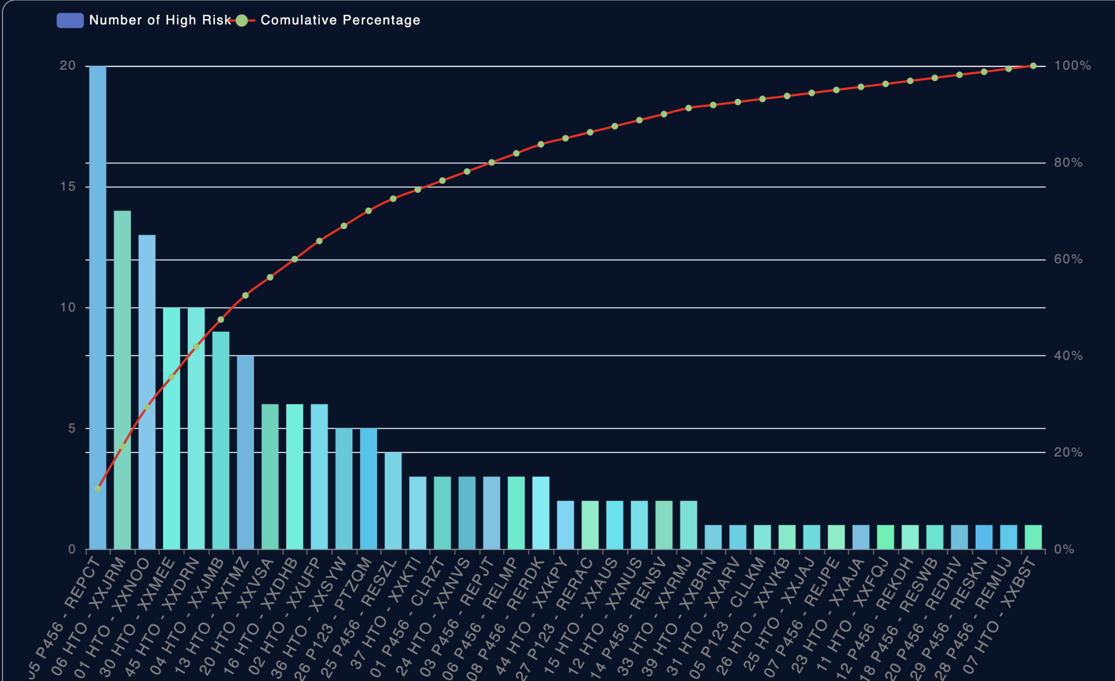 Muestra un eje acumulado, que refleja el porcentaje total de los altos riesgos concentrados por cada grupo de usuarios.